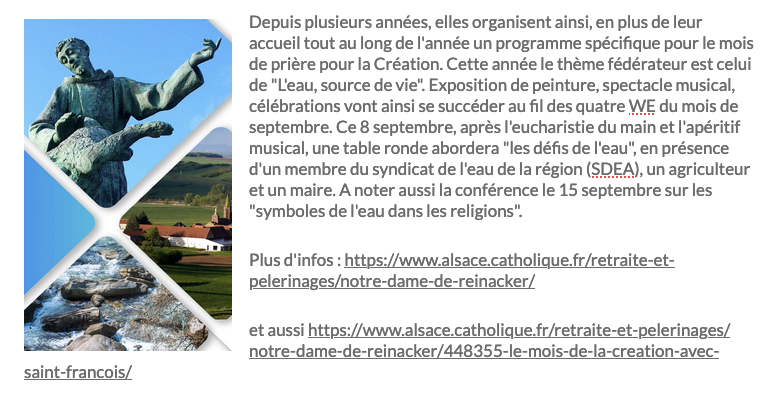 CONNAISSEZ-VOUS LE SANCTUAIRE ALSACIEN DE REINACKER ? Situé sur les hauteurs du village de Reutenbourg, l’église et les bâtiments conventuels accueillent depuis la fin du XIXe siècle, une communauté de religieuses franciscaines (de la miséricorde), devenues les Soeurs de Saint François d’assise (https://www.soeurs-saint-francois-assise.org/) particulièrement sensibles aux enjeux de l’écologie intégrale. (art. E&E Sept 2024)